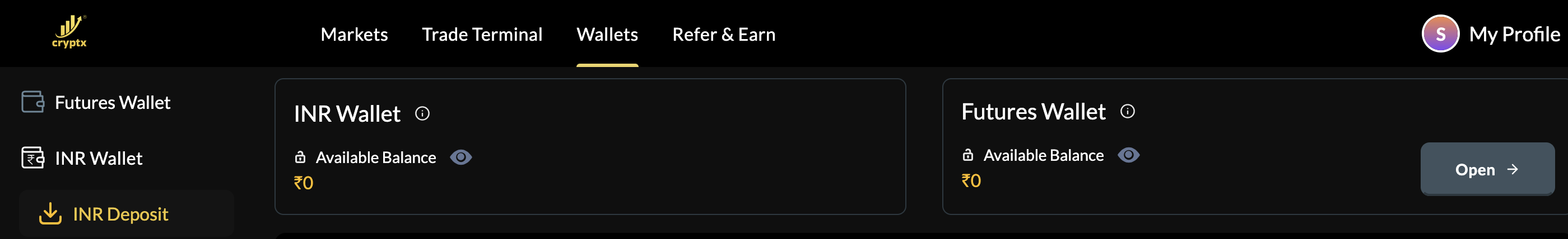 Step 1 - Log into your cryptxindia.com account, click on wallet button at the top, then select INR wallet followed by INR deposit