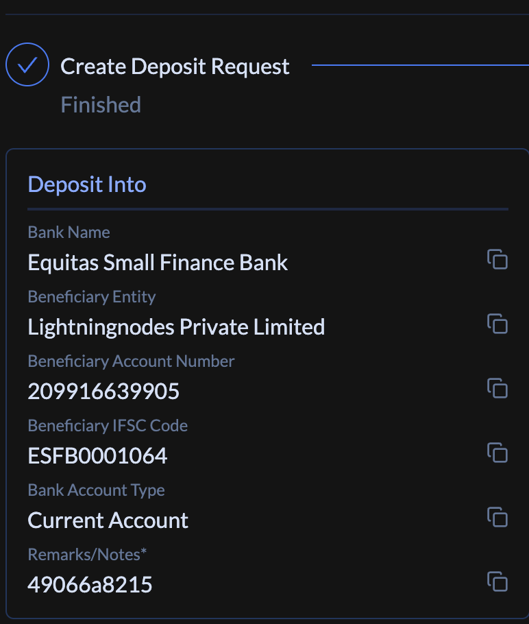 Once you click on Create Deposit , You will be able to view Beneficiary bank account information, which you’ll use for the transfer.