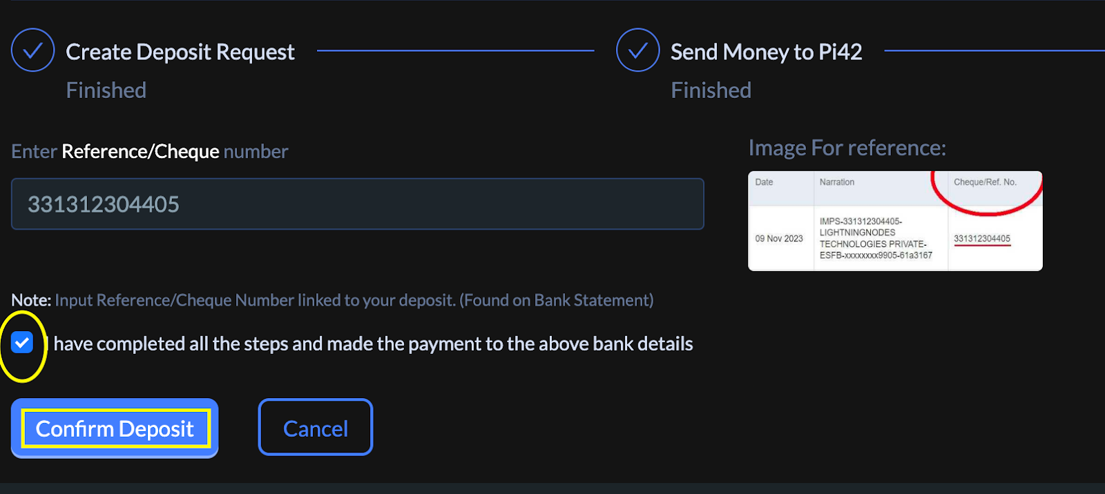 Click 'Confirm Deposit. You can find this number under the transaction details in your banking app.