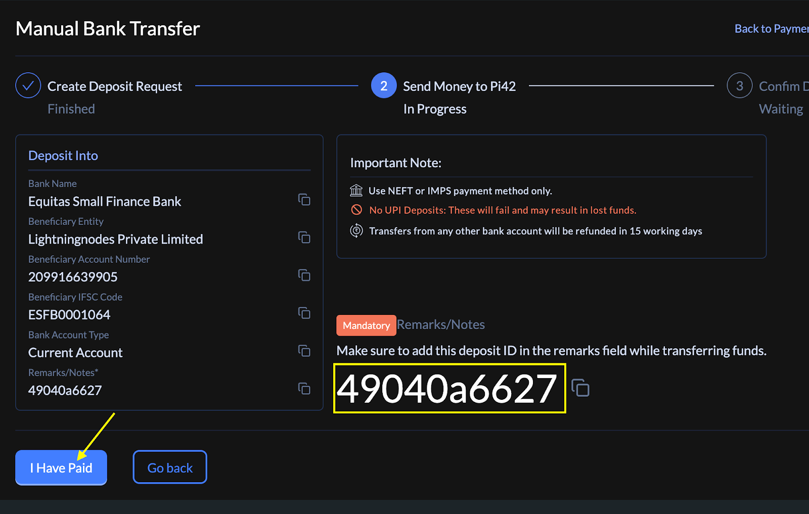 Include this ID in the 'Remarks' field during your bank transfer. It's essential for tracking your deposit accurately.